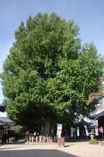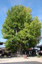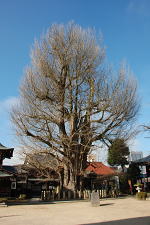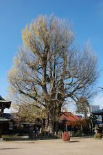 推定樹齢1250年以上の雄株。由来の一つとして、飛騨国分寺創建の際に、行基菩薩が手植えしたとも伝えられています。樹齢を重ねたイチョウに垂れ下がる気根が、乳房のように見えることから「乳イチョウ」とも呼ばれています。古くから乳の出ない母親の母乳の出や、子授け、安産、子育てなどの信仰を集めてきました。樹下には子どもたちを見守る親子の地蔵菩薩がまつられています。
