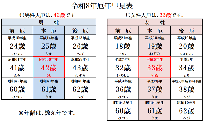 〇女性本厄 19歳(平成20年生)/33歳(平成6年生)/37歳(平成2年生)/61歳(昭和41年生)